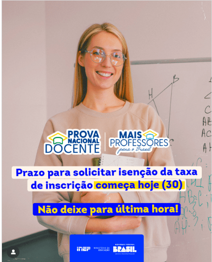 Começa nesta segunda-feira, 30 de junho, o período para solicitação de isenção da taxa de inscrição da Prova Nacional Docente (PND). Os interessados devem fazer o pedido exclusivamente pelo Sistema PND, disponível online. O prazo vai até o dia 4 de julho.